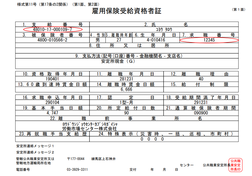 説明会に参加すると雇用保険受給資格者証がもらえます。そこには、色々情報が出てますが、特に求職申込日や口座情報、給付制限期間や基本手当日額、給付日数などチェックすべき項目があるので要確認です。また、早期に就職した場合の個別の再就職手当の試算表も配布されました。